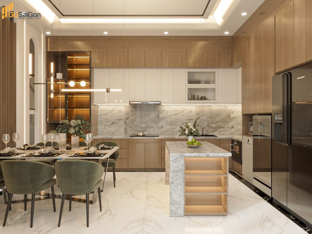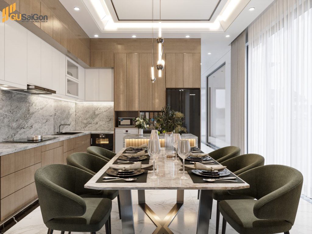 Không gian phòng bếp kết hợp với phòng ăn hiện đại