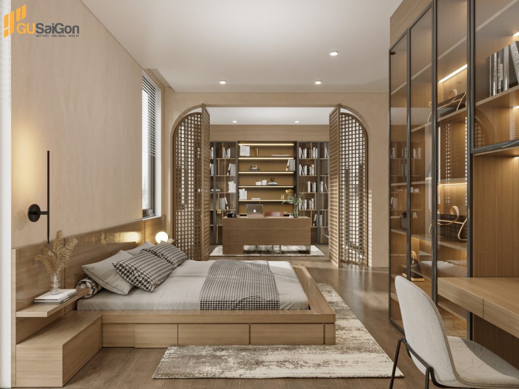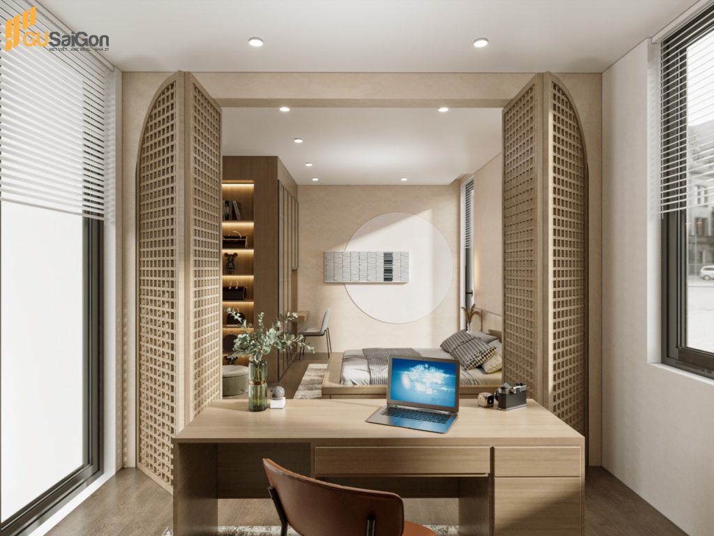 Phòng ngủ kết hợp phòng làm việc, thiết kế cửa ngăn cách độc đáo