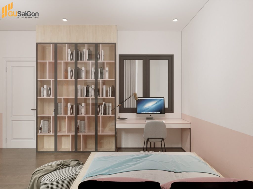 Bàn học và kệ sách đối diện giường ngủ