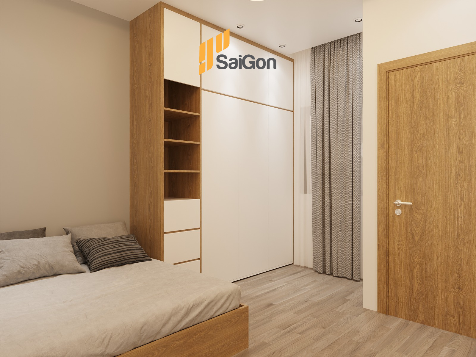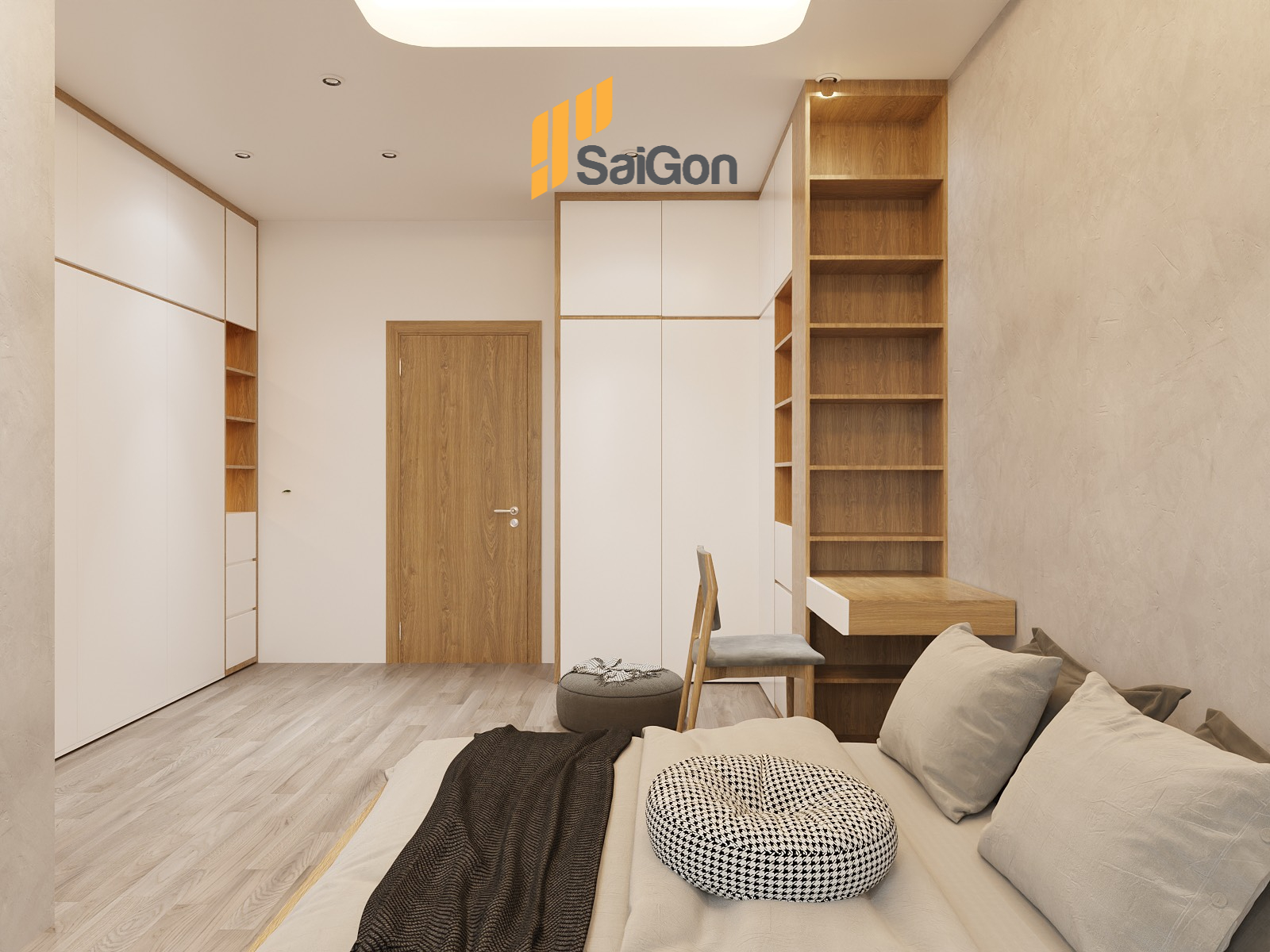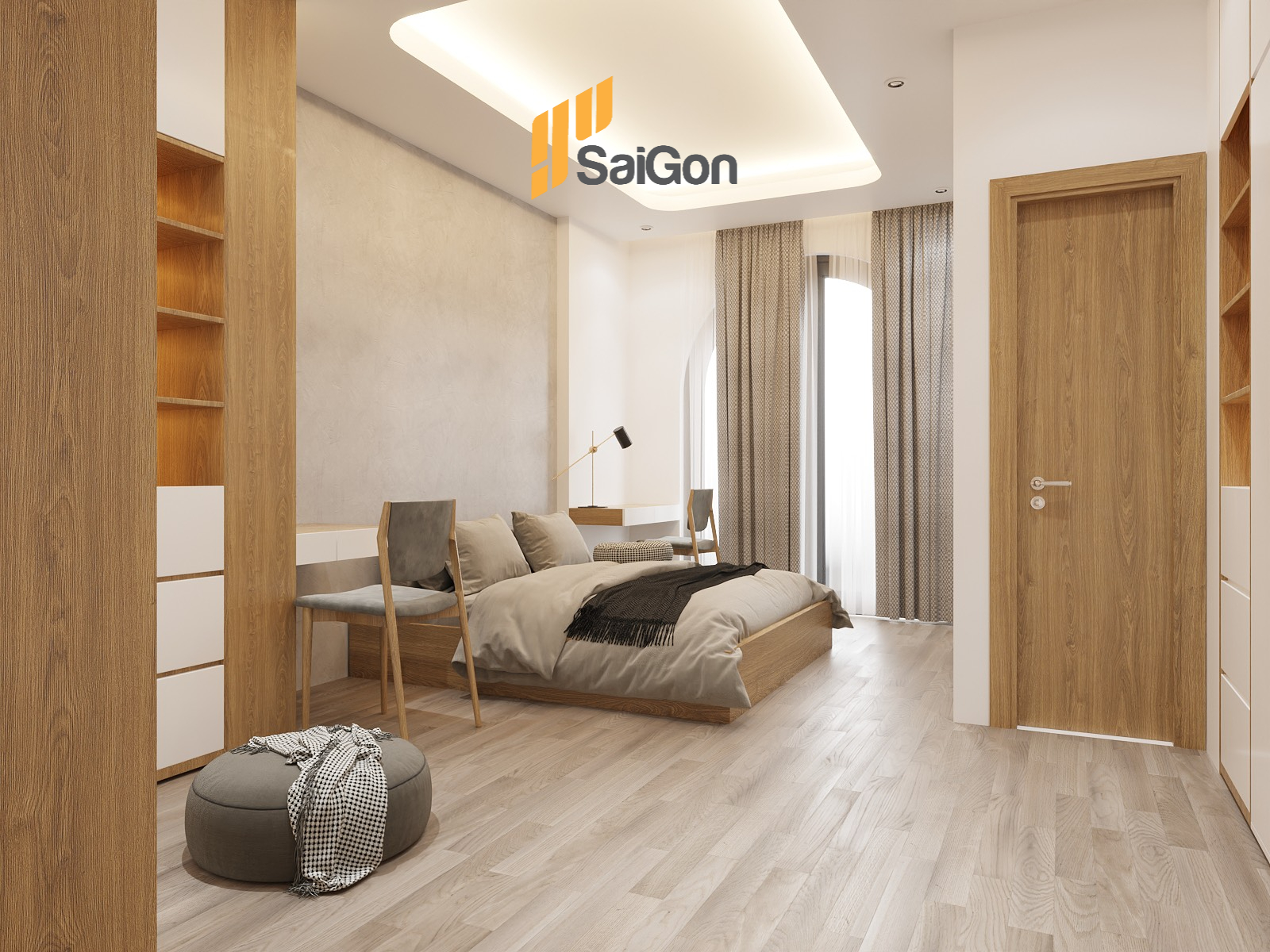 Không gian phòng ngủ đươc thiết kế với màu sắc hài hòa cùng gam màu với tổng thể của căn nhà. Lấy tông màu trắng và vàng làm chủ đạo kết hợp với nội thất và sàn màu gỗ khiến cho căn phòng ngủ bậc lên sự sang trọng, ấm cúng.