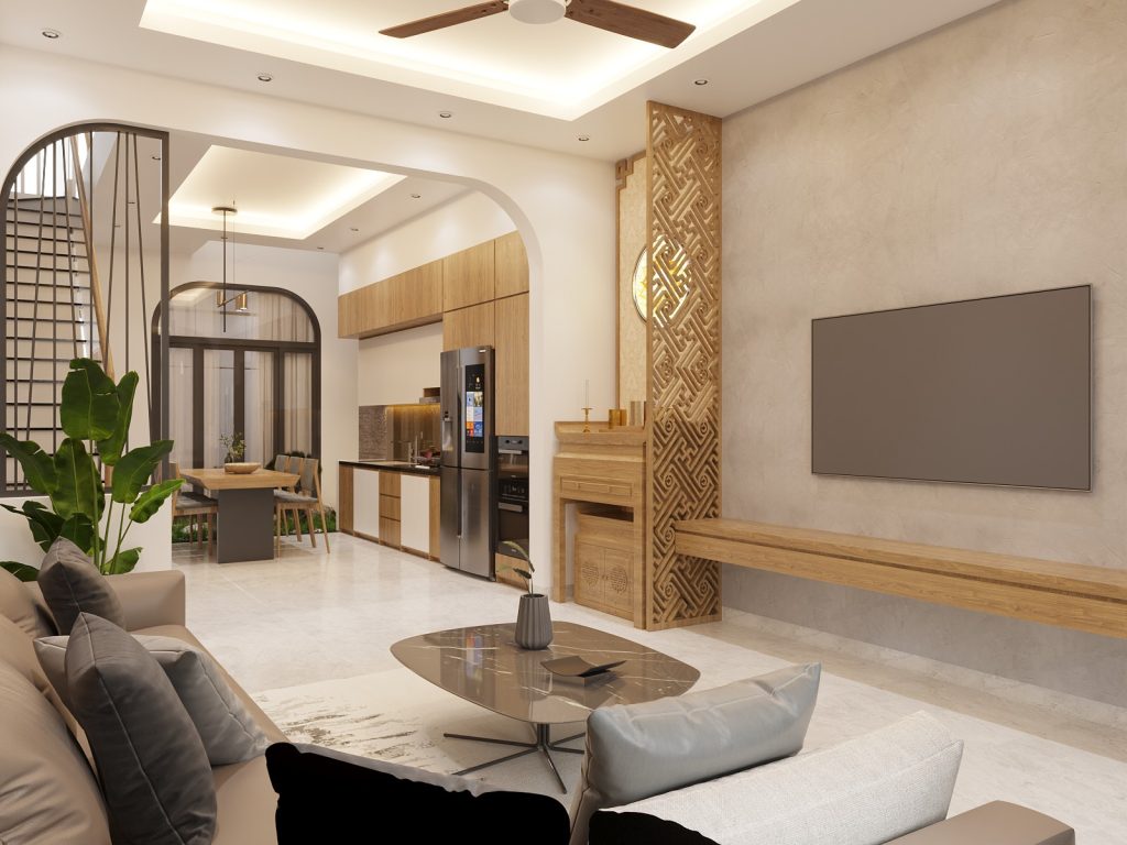 Không gian phòng khách thiết kế trẻ trung theo phòng cách hiện đại, phòng khách là sự kết hợp giữa tông màu trắng làm chủ đạo kết hợp tông màu gỗ tạo cảm giác ấm cúng, thông thoáng và hướng sáng cho không gian sống.