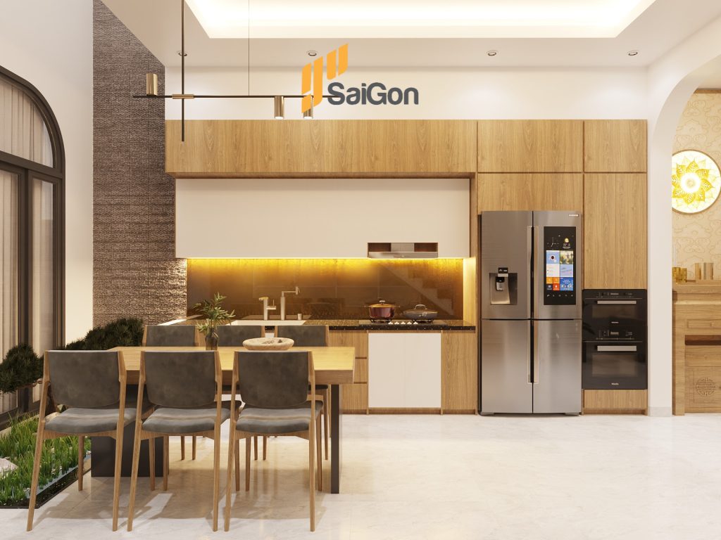 Tông màu của căn bếp cũng được thiết kế theo tông vàng phù hợp phong thủy của gia chủ giúp cho gia đình hòa thuận, ấm no và những bữa ăn sum vầy.
