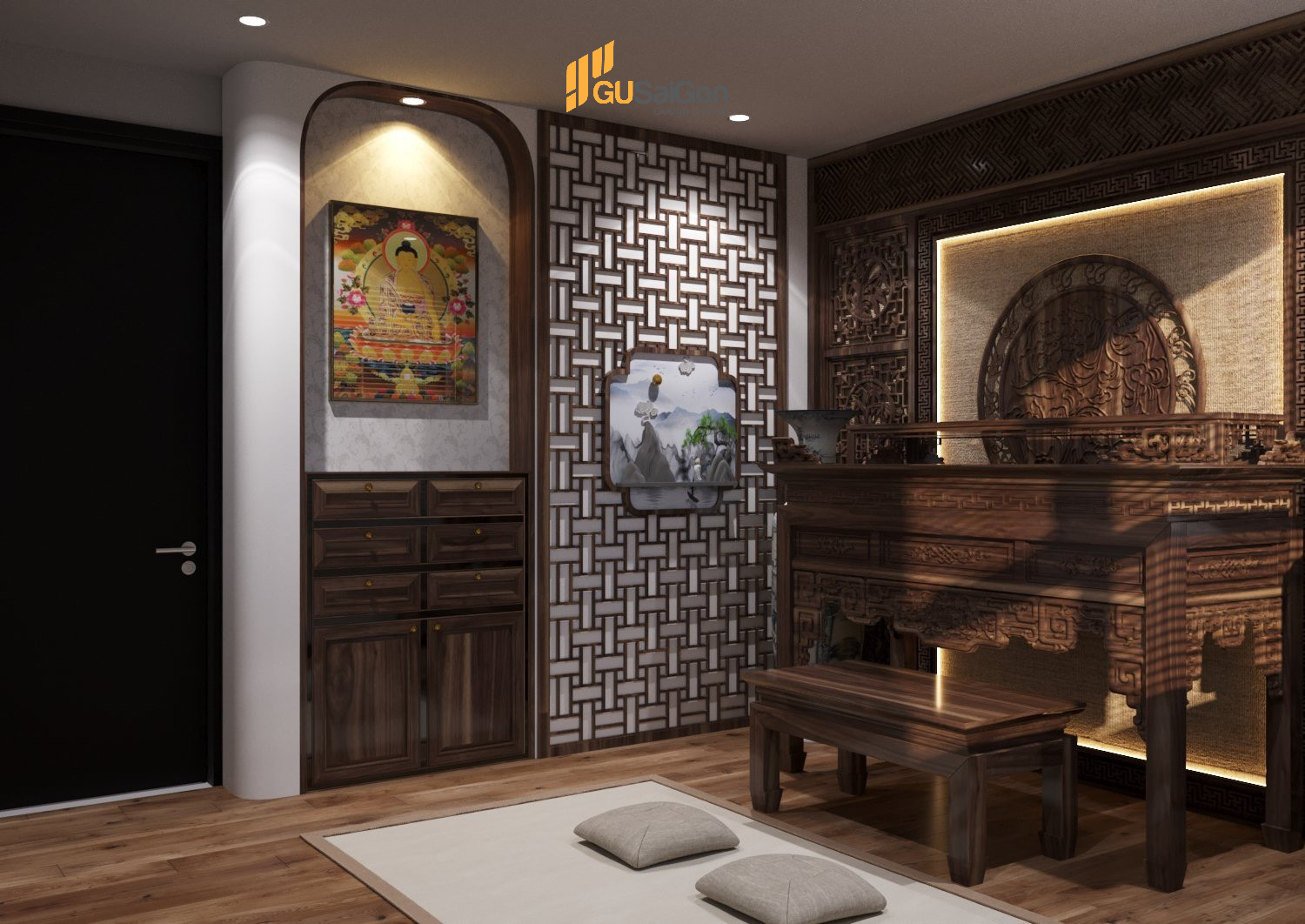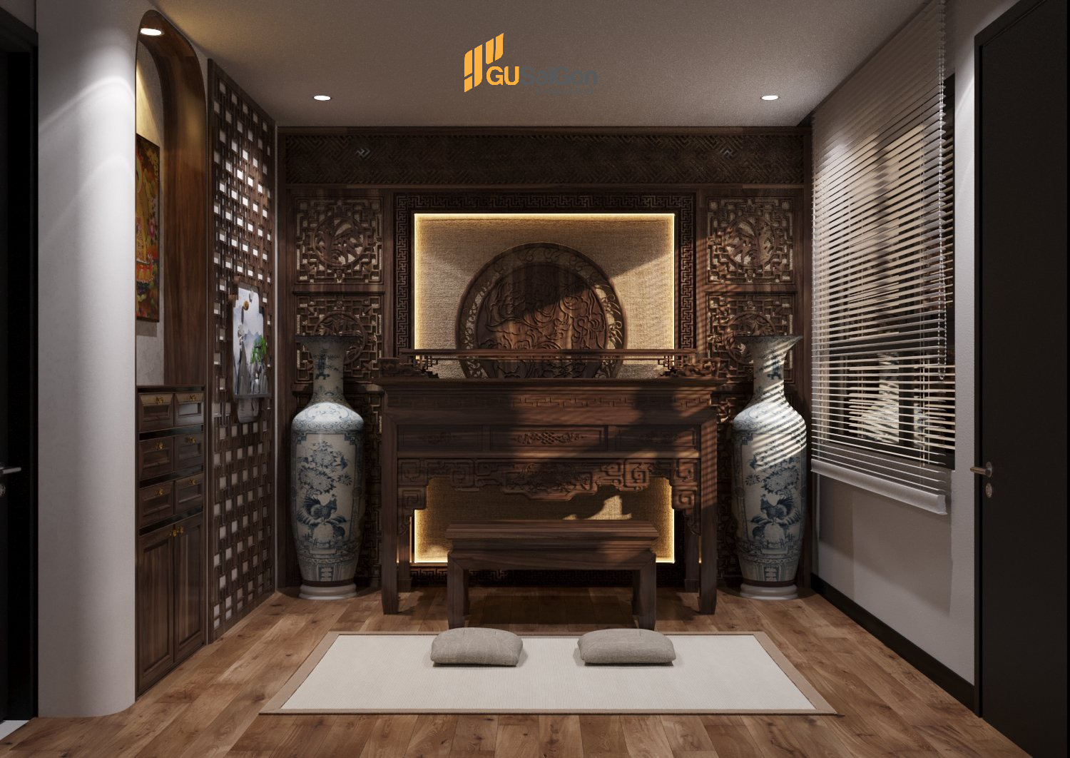 Không gian thờ cúng được thiết kế trang nghiêm và cổ kính với gam màu nâu gỗ kết hợp với các chi thiết hoa văn điêu khắc tinh xảo.