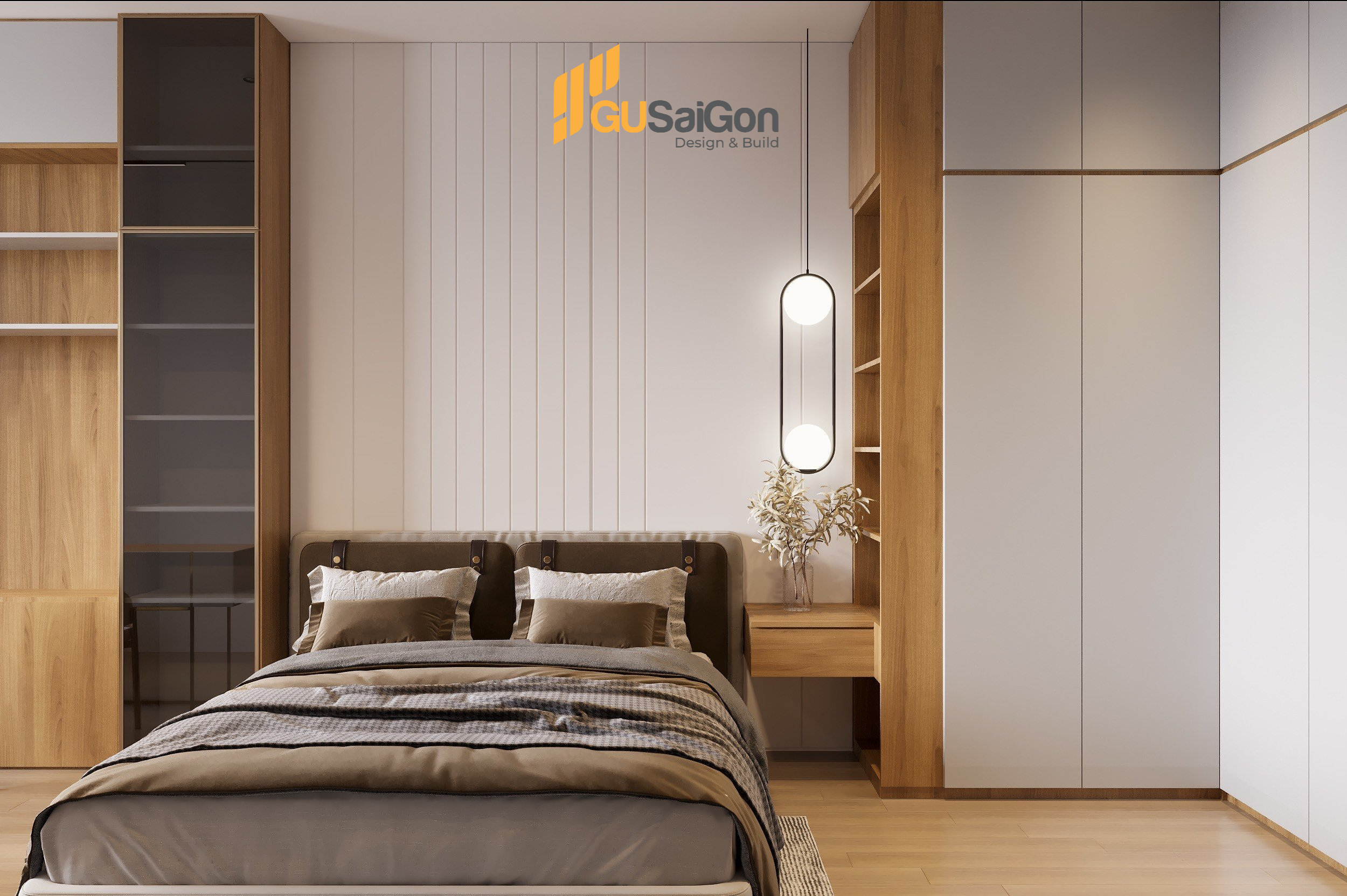 Nội thất ở phòng ngủ mang phong cách tối giản, thông minh và cũng rất tiện nghi. Ngoài giường ngủ lớn, còn có một hệ tủ quần áo kết hợp với bàn làm việc. Đơn giản mà tiện nghi là đặc điểm nổi bật của phòng ngủ này.